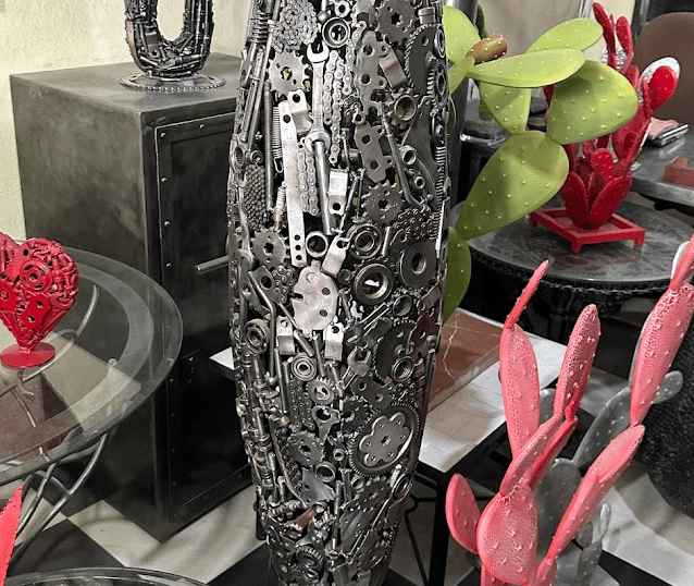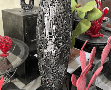Pièces décoratives en métal, réalisées artisanalement, mêlant matière brute et finitions soignées.